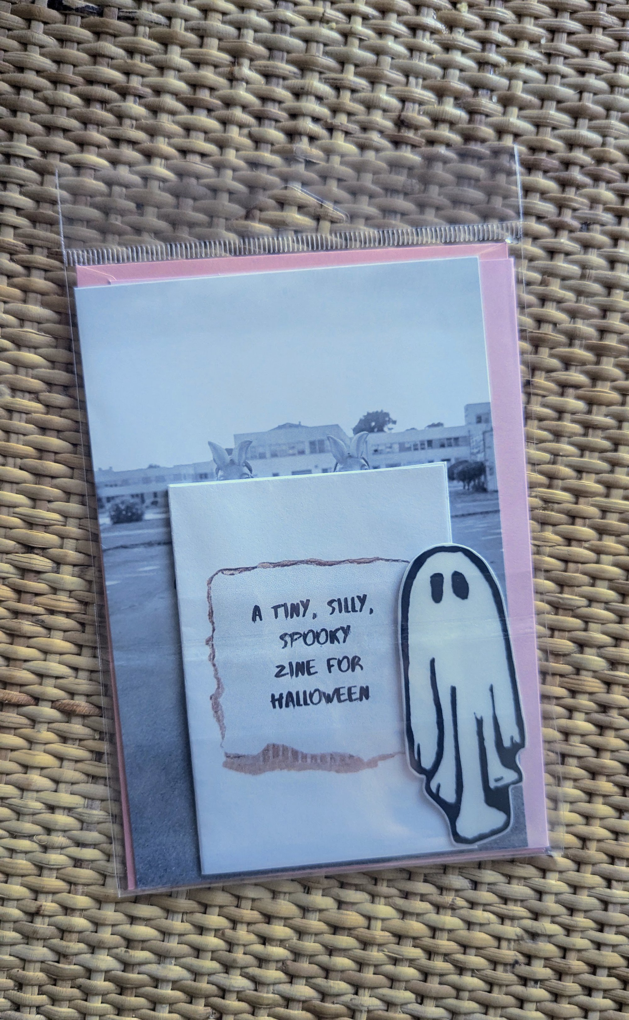 Each pack comes with punk style, pink folding greeting card featuring linocut style flair. Of course, a matching envelop, also pink, along with a high quality, Creepy Rabbits postcard. Also tucked into these bundles is a perfectly spooky comic mini zine and a matching sticker of the featured ghost character. Originally carved from a pink pearl eraser, little ghost has been on quite an adventure!