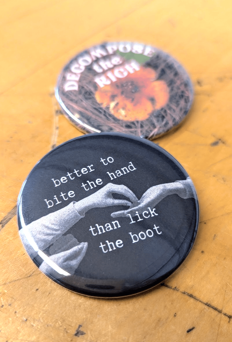 Our lead artist is a member of their local printing and publishing resource center, where they create these very button sets! Cut and assembled by hand, Mel creates these o-PIN-ions with the hope that like-minded folks will be inspired to get loud and get organized.